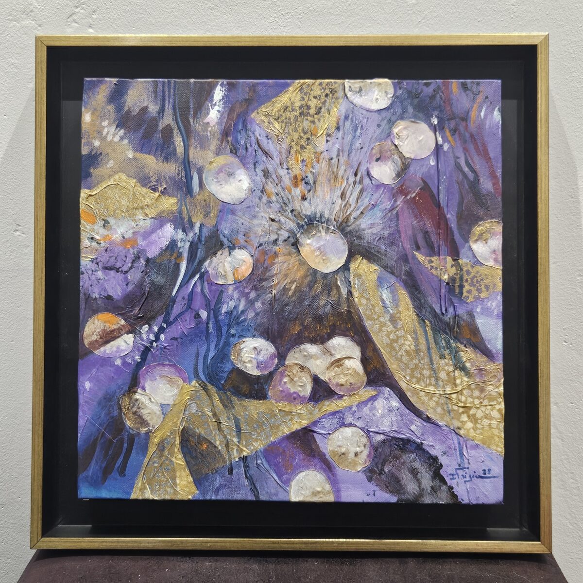 30×30 – Acrylique , collage de papier et de monnaie du Pape sur châssis toilé – 2025 – Cadre américain noir avec filet doré